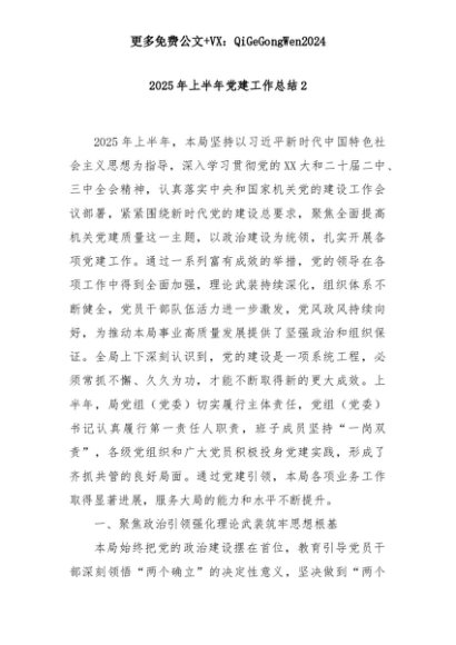 【七哥公文】2025年:【七哥公文】2025年上半年党建工作总结2+更多免费公文+VX:QiGeGongWen2024+更多免费公文+VX:QiGeGongWen2024