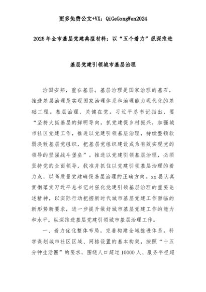 【七哥公文】2025年:【七哥公文】2025年全市基层党建典型材料:以“五个着力”纵深推进基层党建引领城市基层治理+更多免费公文+VX:QiGeGongWen2024+更多免费公文+VX:QiGeGongWen2024