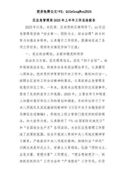 【七哥公文】2025年:【七哥公文】区应急管理局2025年上半年工作总结报告+更多免费公文+VX:QiGeGongWen2024+更多免费公文+VX:QiGeGongWen2024