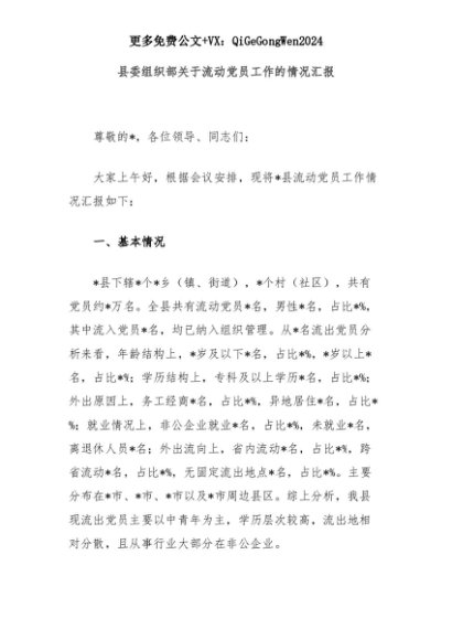 【七哥公文】2025年:【七哥公文】县委组织部关于流动党员工作的情况汇报+更多免费公文+VX:QiGeGongWen2024+更多免费公文+VX:QiGeGongWen2024