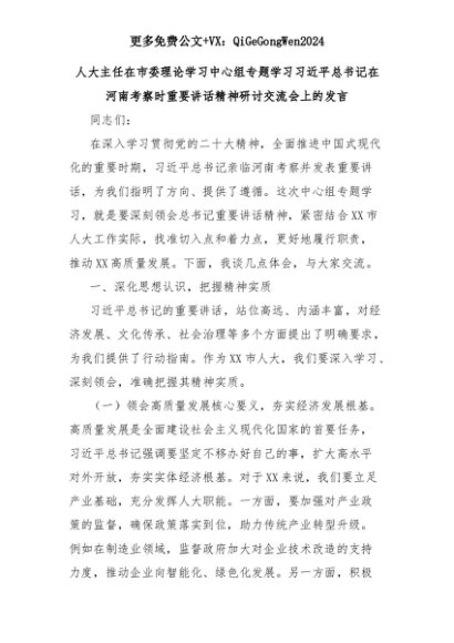 【七哥公文】2025年:【七哥公文】人大主任在市委理论学习中心组专题学习习近平总书记在河南考察时重要讲话精神研讨交流会上的发言+更多免费公文+VX:QiGeGongWen2024+更多免费公文+VX:QiGeGongWen2024