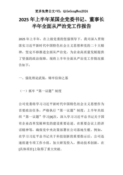 【七哥公文】2025年:【七哥公文】2025年上半年某国企党委书记、董事长半年全面从严治党工作报告+更多免费公文+VX:QiGeGongWen2024+更多免费公文+VX:QiGeGongWen2024