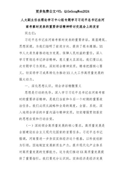 【七哥公文】2025年:【七哥公文】人大副主任在理论学习中心组专题学习习近平总书记在河南考察时发表的重要讲话精神研讨交流会上的发言+更多免费公文+VX:QiGeGongWen2024+更多免费公文+VX:QiGeGongWen2024