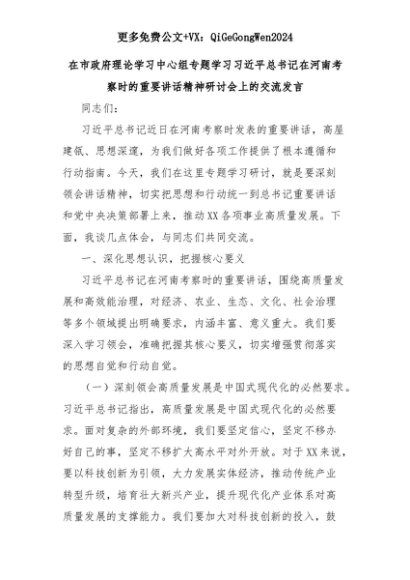 【七哥公文】2025年:【七哥公文】在市政府理论学习中心组专题学习习近平总书记在河南考察时的重要讲话精神研讨会上的交流发言+更多免费公文+VX:QiGeGongWen2024+更多免费公文+VX:QiGeGongWen2024