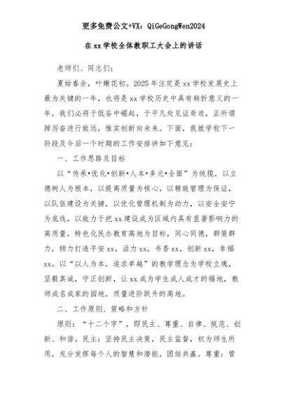 【七哥公文】2025年:【七哥公文】在xx学校全体教职工大会上的讲话+更多免费公文+VX:QiGeGongWen2024+更多免费公文+VX:QiGeGongWen2024