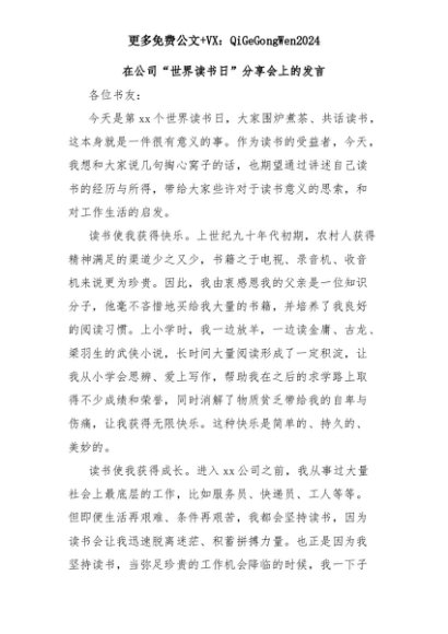 【七哥公文】2025年:【七哥公文】在公司“世界读书日”分享会上的发言+更多免费公文+VX:QiGeGongWen2024+更多免费公文+VX:QiGeGongWen2024