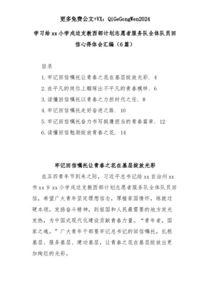 【七哥公文】2025年:【七哥公文】(6篇)学习给xx小学戍边支教西部计划志愿者服务队全体队员回信心得体会汇编+更多免费公文+VX:QiGeGongWen2024+更多免费公文+VX:QiGeGongWen2024