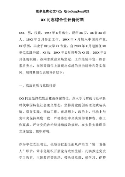 【七哥公文】2025年:【七哥公文】XX同志综合性评价材料 2+更多免费公文+VX:QiGeGongWen2024+更多免费公文+VX:QiGeGongWen2024