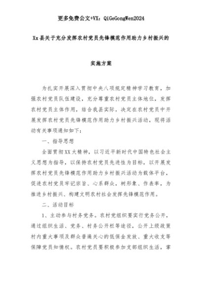 【七哥公文】2025年:【七哥公文】Xx县关于充分发挥农村党员先锋模范作用助力乡村振兴的实施方案+更多免费公文+VX:QiGeGongWen2024+更多免费公文+VX:QiGeGongWen2024