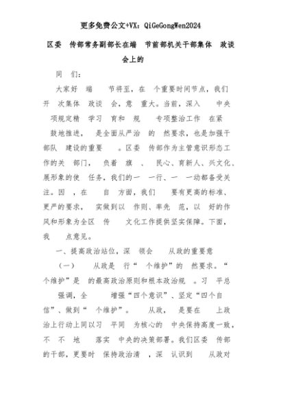 【七哥公文】2025年:【七哥公文】区委宣传部常务副部长在端午节前部机关干部集体廉政谈话会上的讲话稿+更多免费公文+VX:QiGeGongWen2024+更多免费公文+VX:QiGeGongWen2024