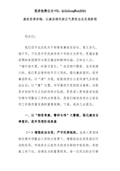 【七哥公文】2025年:【七哥公文】廉政党课讲稿:以廉洁清风扬正气勇担当启发展新程+更多免费公文+VX:QiGeGongWen2024+更多免费公文+VX:QiGeGongWen2024