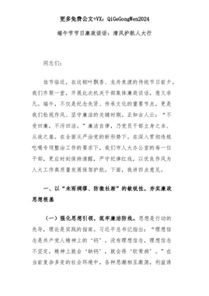 【七哥公文】2025年:【七哥公文】端午节节日廉政谈话:清风护航人大行+更多免费公文+VX:QiGeGongWen2024+更多免费公文+VX:QiGeGongWen2024