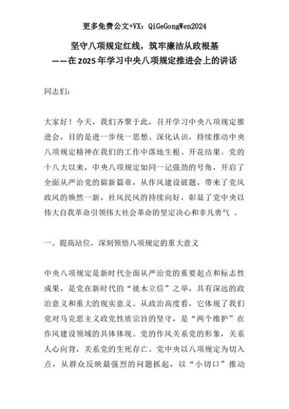 【七哥公文】2025年:【七哥公文】坚守八项规定红线,筑牢廉洁从政根基——在2025年学习中央八项规定推进会上的讲话+更多免费公文+VX:QiGeGongWen2024+更多免费公文+VX:QiGeGongWen2024