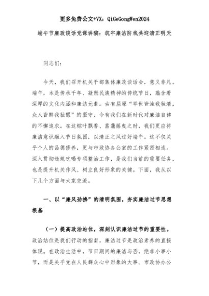 【七哥公文】2025年:【七哥公文】端午节廉政谈话党课讲稿:筑牢廉洁防线共迎清正明天+更多免费公文+VX:QiGeGongWen2024+更多免费公文+VX:QiGeGongWen2024