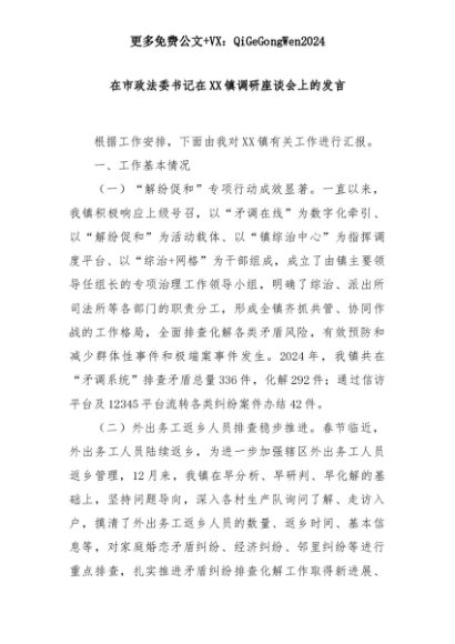 【七哥公文】2025年:【七哥公文】在市政法委书记在XX镇调研座谈会上的发言+更多免费公文+VX:QiGeGongWen2024+更多免费公文+VX:QiGeGongWen2024