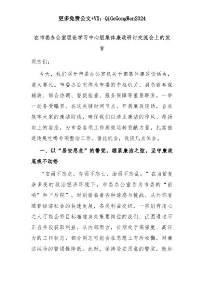 【七哥公文】2025年:【七哥公文】在市委办公室理论学习中心组集体廉政研讨交流会上的发言+更多免费公文+VX:QiGeGongWen2024+更多免费公文+VX:QiGeGongWen2024