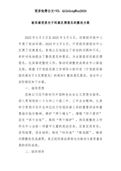【七哥公文】2025年:【七哥公文】被巡察党委关于巡察反馈意见的整改方案+更多免费公文+VX:QiGeGongWen2024+更多免费公文+VX:QiGeGongWen2024