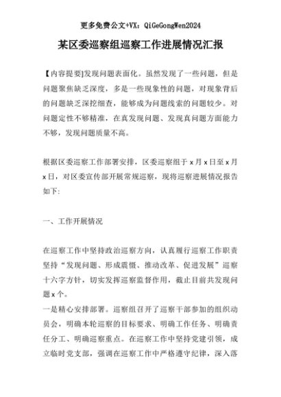 【七哥公文】2025年:【七哥公文】某区委巡察组巡察工作进展情况汇报+更多免费公文+VX:QiGeGongWen2024+更多免费公文+VX:QiGeGongWen2024
