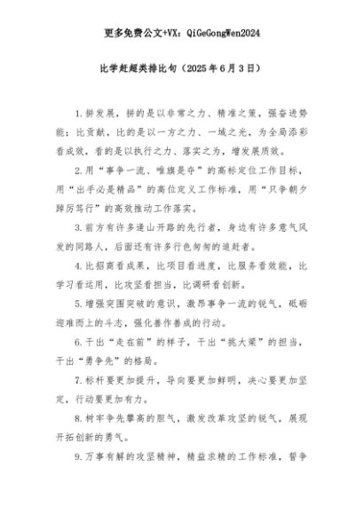 【七哥公文】2025年:【七哥公文】比学赶超类排比句(2025年6月3日)+更多免费公文+VX:QiGeGongWen2024+更多免费公文+VX:QiGeGongWen2024