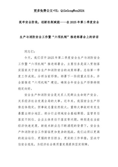 【七哥公文】2025年:【七哥公文】筑牢安全防线,创新机制赋能——在2025年第二季度安全生产与消防安全工作暨“六项机制”推进部署会上的讲话+更多免费公文+VX:QiGeGongWen2024+更多免费公文+VX:QiGeGongWen2024
