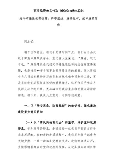 【七哥公文】2025年:【七哥公文】端午节廉政党课讲稿:严守底线,廉洁过节,筑牢廉政防线+更多免费公文+VX:QiGeGongWen2024+更多免费公文+VX:QiGeGongWen2024