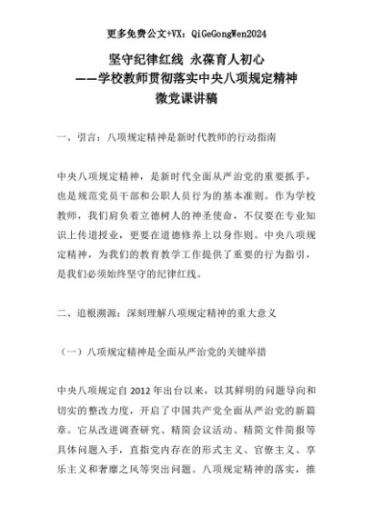 【七哥公文】2025年:【七哥公文】坚守纪律红线 永葆育人初心——学校教师贯彻落实中央八项规定精神微党课讲稿+更多免费公文+VX:QiGeGongWen2024+更多免费公文+VX:QiGeGongWen2024