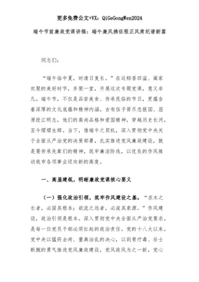 【七哥公文】2025年:【七哥公文】端午节前廉政党课讲稿:端午廉风拂征程正风肃纪谱新篇+更多免费公文+VX:QiGeGongWen2024+更多免费公文+VX:QiGeGongWen2024