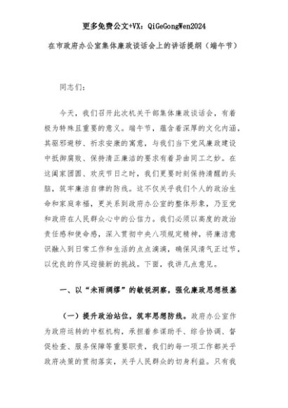 【七哥公文】2025年:【七哥公文】在市政府办公室集体廉政谈话会上的讲话提纲(端午节)+更多免费公文+VX:QiGeGongWen2024+更多免费公文+VX:QiGeGongWen2024
