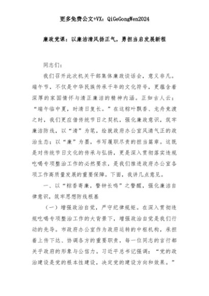 【七哥公文】2025年:【七哥公文】廉政党课:以廉洁清风扬正气,勇担当启发展新程+更多免费公文+VX:QiGeGongWen2024+更多免费公文+VX:QiGeGongWen2024