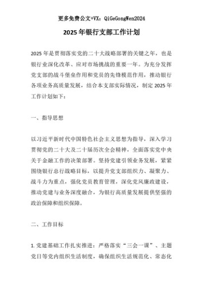 【七哥公文】2025年:【七哥公文】2025年银行支部工作计划+更多免费公文+VX:QiGeGongWen2024+更多免费公文+VX:QiGeGongWen2024