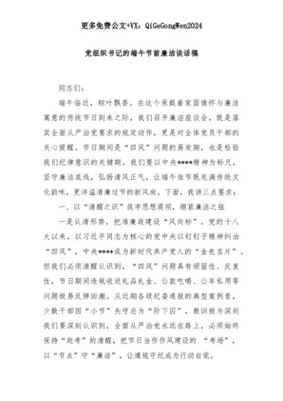 【七哥公文】2025年:【七哥公文】党组织书记的端午节前廉洁谈话稿+更多免费公文+VX:QiGeGongWen2024+更多免费公文+VX:QiGeGongWen2024