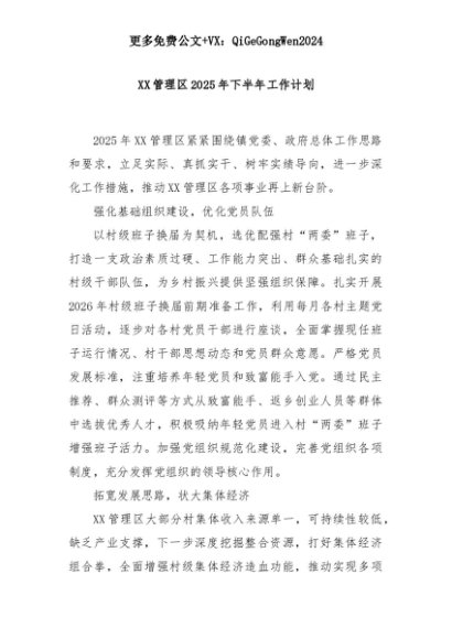 【七哥公文】2025年:【七哥公文】XX管理区2025年下半年工作计划+更多免费公文+VX:QiGeGongWen2024+更多免费公文+VX:QiGeGongWen2024