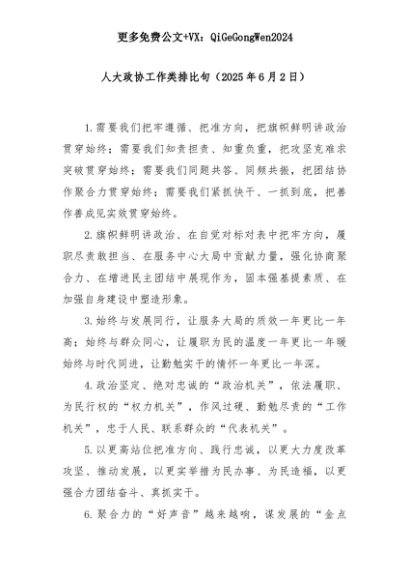 【七哥公文】2025年:【七哥公文】人大政协工作类排比句(2025年6月2日)+更多免费公文+VX:QiGeGongWen2024+更多免费公文+VX:QiGeGongWen2024