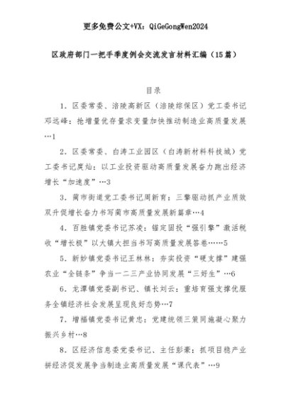 【七哥公文】2025年:【七哥公文】(15篇)区政府部门一把手季度例会交流发言材料汇编+更多免费公文+VX:QiGeGongWen2024+更多免费公文+VX:QiGeGongWen2024