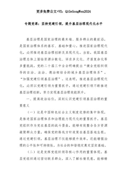 【七哥公文】2025年:【七哥公文】专题党课:坚持党建引领,提升基层治理现代化水平+更多免费公文+VX:QiGeGongWen2024+更多免费公文+VX:QiGeGongWen2024