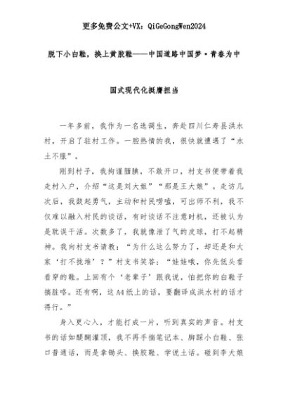 【七哥公文】2025年:【七哥公文】脱下小白鞋,换上黄胶鞋——中国道路中国梦·青春为中国式现代化挺膺担当+更多免费公文+VX:QiGeGongWen2024+更多免费公文+VX:QiGeGongWen2024