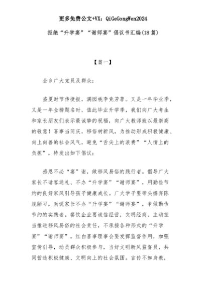 【七哥公文】2025年:【七哥公文】(18篇)拒绝“升学宴”“谢师宴”倡议书汇编+更多免费公文+VX:QiGeGongWen2024+更多免费公文+VX:QiGeGongWen2024