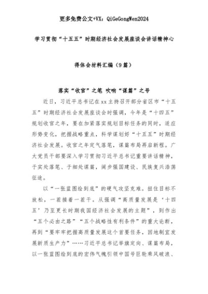 【七哥公文】2025年:【七哥公文】(9篇)学习贯彻“十五五”时期经济社会发展座谈会讲话精神心得体会材料汇编+更多免费公文+VX:QiGeGongWen2024+更多免费公文+VX:QiGeGongWen2024