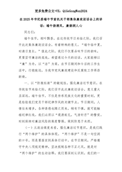 【七哥公文】2025年:【七哥公文】在2025年市纪委端午节前机关干部集体廉政谈话会上的讲话:端午扬清风,廉韵润人心+更多免费公文+VX:QiGeGongWen2024+更多免费公文+VX:QiGeGongWen2024