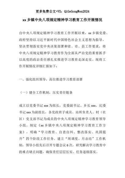 【七哥公文】2025年:【七哥公文】xx乡镇中央八项规定精神学习教育工作开展情况+更多免费公文+VX:QiGeGongWen2024+更多免费公文+VX:QiGeGongWen2024