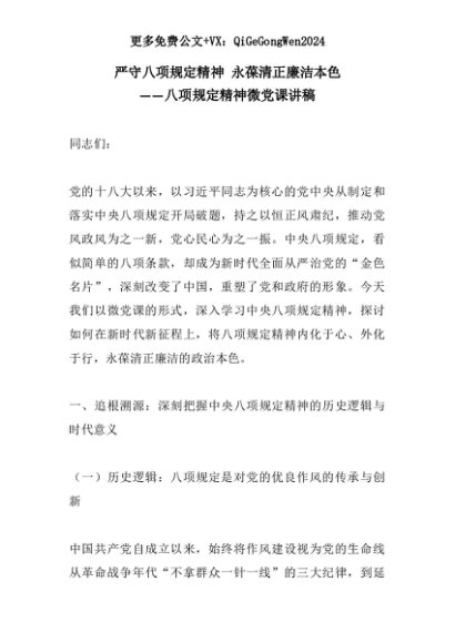 【七哥公文】2025年:【七哥公文】严守八项规定精神 永葆清正廉洁本色——八项规定精神微党课讲稿+更多免费公文+VX:QiGeGongWen2024+更多免费公文+VX:QiGeGongWen2024