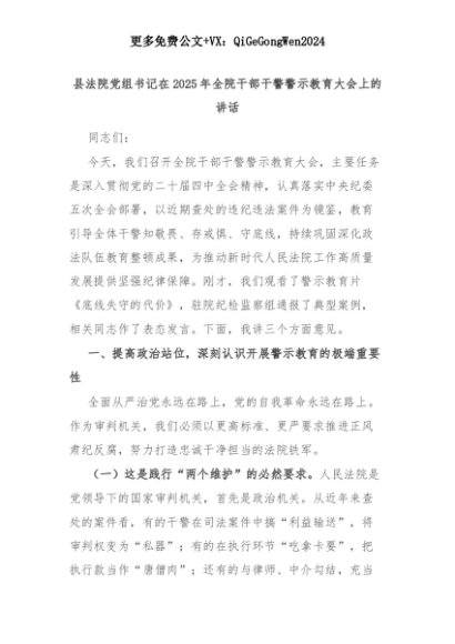 【七哥公文】2025年:【七哥公文】县法院党组书记在2025年全院干部干警警示教育大会上的讲话+更多免费公文+VX:QiGeGongWen2024+更多免费公文+VX:QiGeGongWen2024