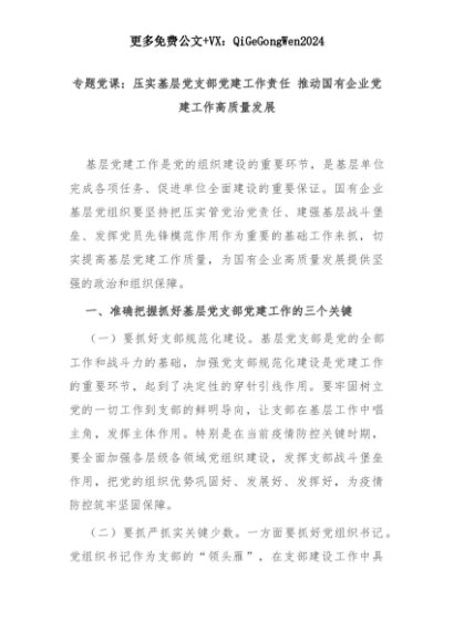 【七哥公文】2025年:【七哥公文】专题党课:压实基层党支部党建工作责任 推动国有企业党建工作高质量发展+更多免费公文+VX:QiGeGongWen2024+更多免费公文+VX:QiGeGongWen2024