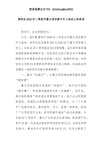 【七哥公文】2025年:【七哥公文】领导在2025年二季度市重大项目集中开工活动上的讲话+更多免费公文+VX:QiGeGongWen2024+更多免费公文+VX:QiGeGongWen2024