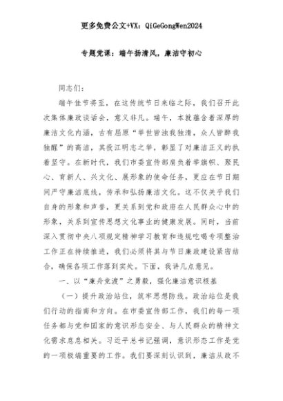 【七哥公文】2025年:【七哥公文】专题党课:端午扬清风,廉洁守初心+更多免费公文+VX:QiGeGongWen2024+更多免费公文+VX:QiGeGongWen2024
