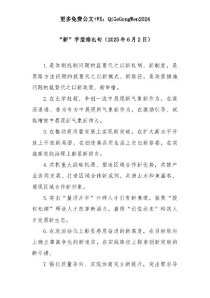 【七哥公文】2025年:【七哥公文】“新”字型排比句(2025年6月2日)+更多免费公文+VX:QiGeGongWen2024+更多免费公文+VX:QiGeGongWen2024