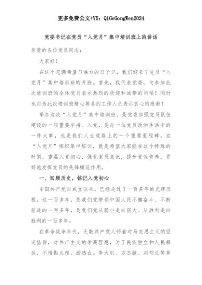 【七哥公文】2025年:【七哥公文】党委书记在党员“入党月”集中培训班上的讲话+更多免费公文+VX:QiGeGongWen2024+更多免费公文+VX:QiGeGongWen2024