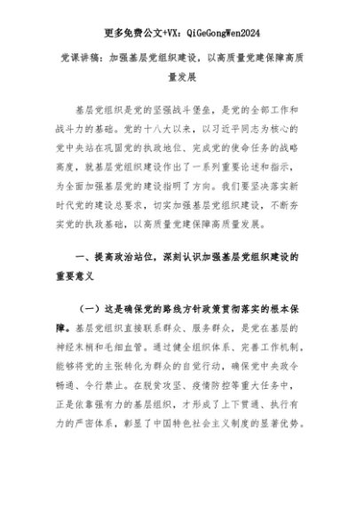 【七哥公文】2025年:【七哥公文】党课讲稿:加强基层党组织建设,以高质量党建保障高质量发展+更多免费公文+VX:QiGeGongWen2024+更多免费公文+VX:QiGeGongWen2024