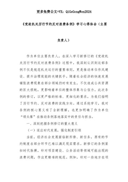 【七哥公文】2025年:【七哥公文】《党政机关厉行节约反对浪费条例》学习心得体会(主要负责人)+更多免费公文+VX:QiGeGongWen2024+更多免费公文+VX:QiGeGongWen2024