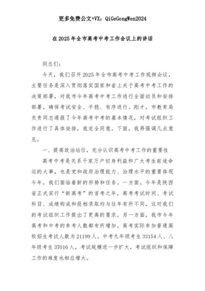 【七哥公文】2025年:【七哥公文】在2025年全市高考中考工作会议上的讲话+更多免费公文+VX:QiGeGongWen2024+更多免费公文+VX:QiGeGongWen2024